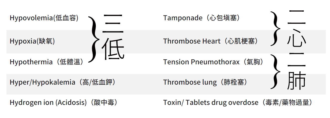 - 無脈搏的VT或VF(心室纖維顫動Ventricular fibrillation、心室頻脈Ventricular Tachycardia)