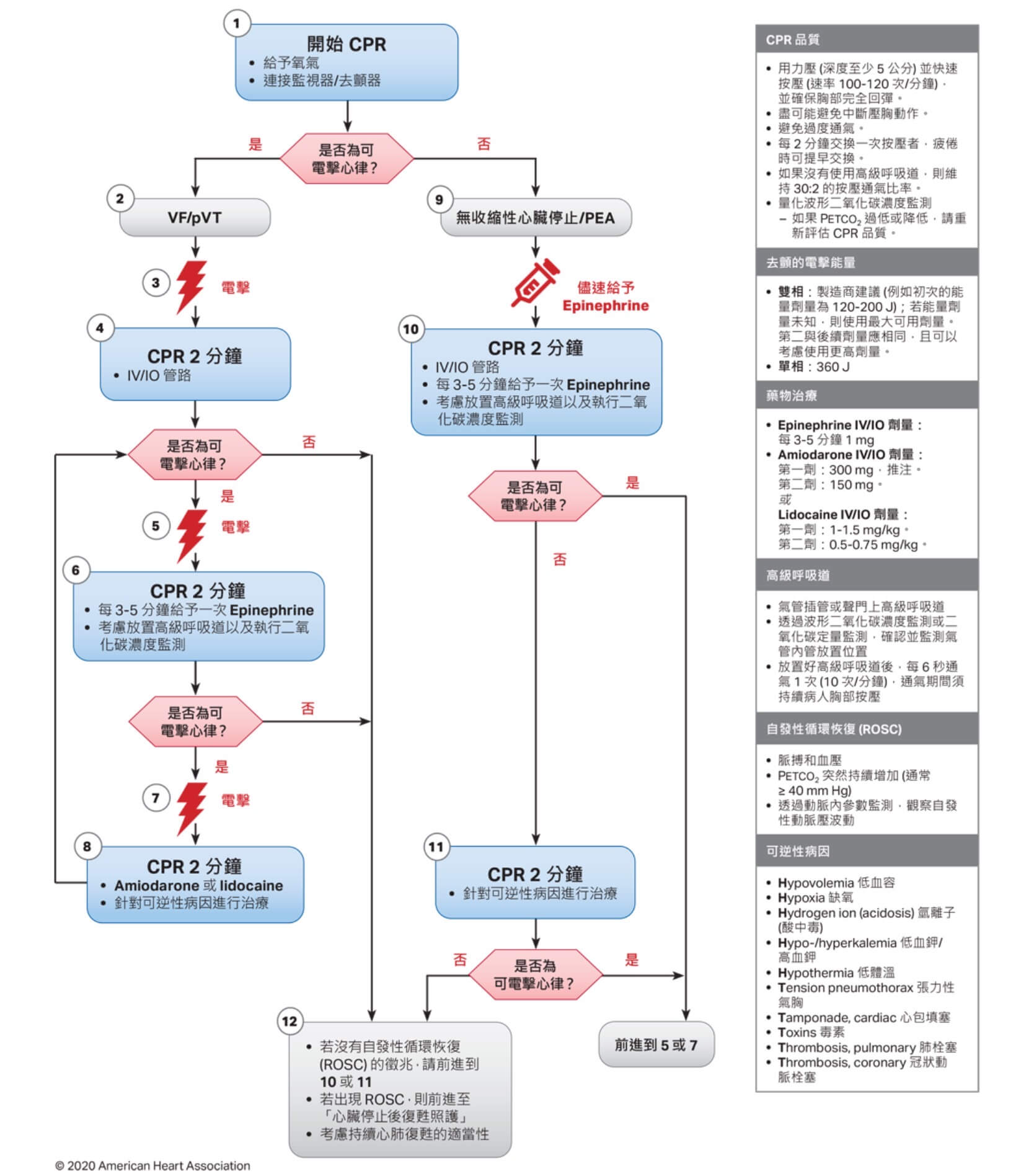 所以Megacode臨床模擬考試時腦中就是兩個主幹、四條處理流程這樣,看考官考你哪條流程千萬不要搞錯了,選錯流程不管你做什麼處置都會是錯誤的喔~